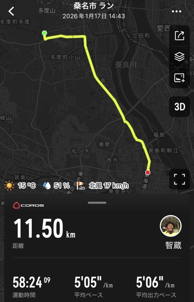 多度大社で参ってから車で桑名のホテルまで行く時間と、11.5キロ走る時間は同じ。