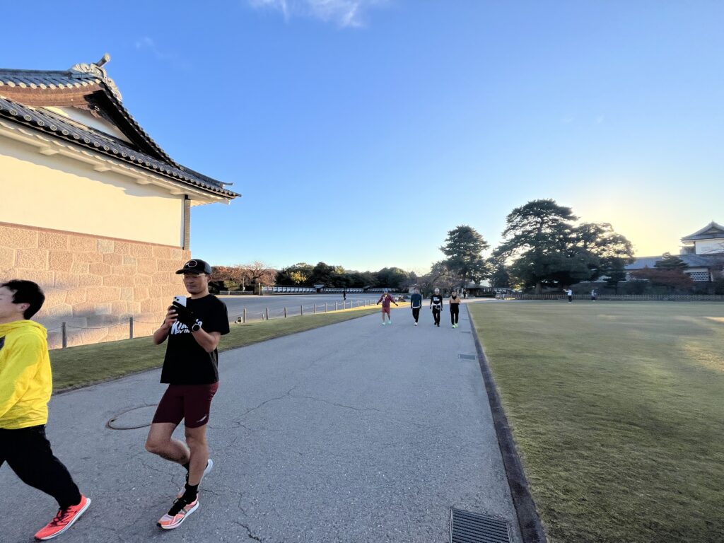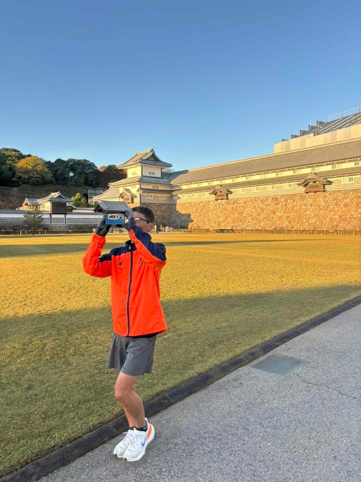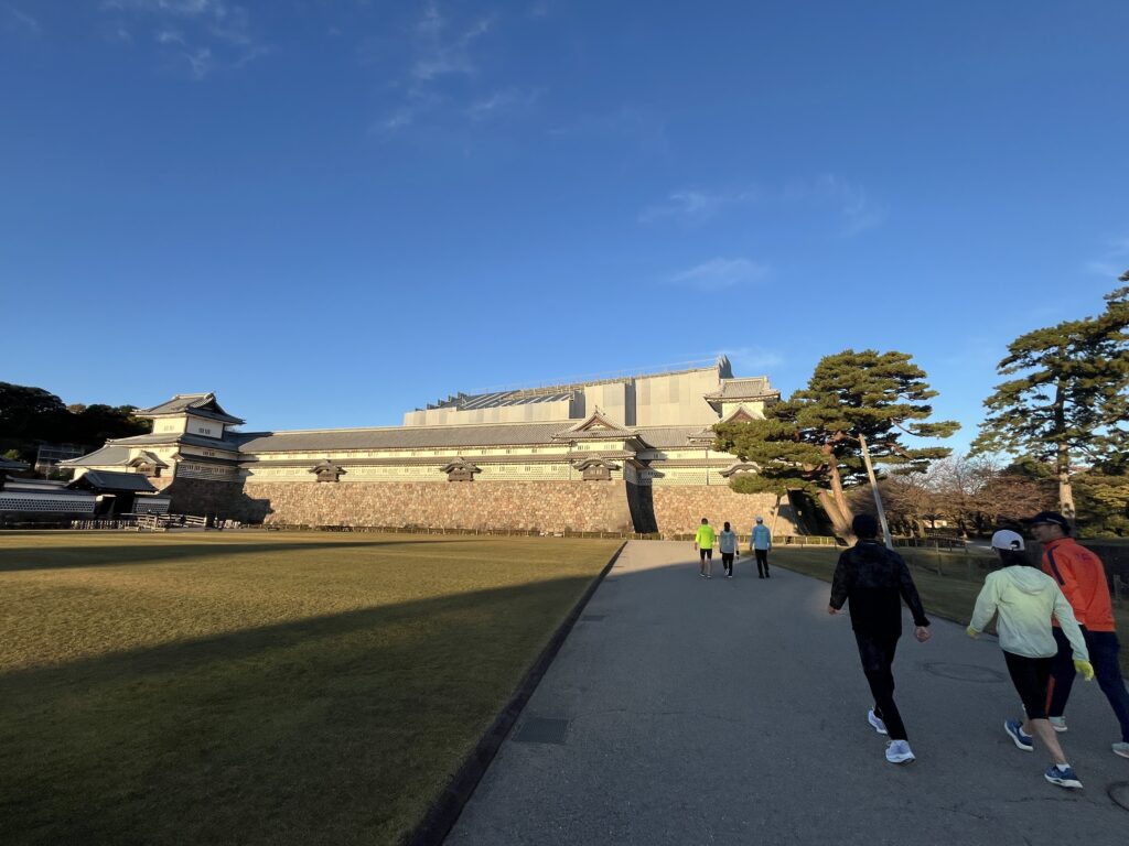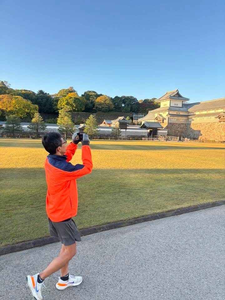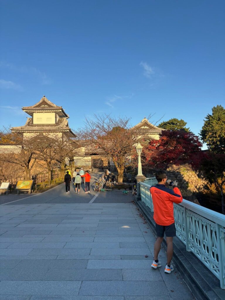 金沢城とチームメンバーを撮る人を撮る写真。