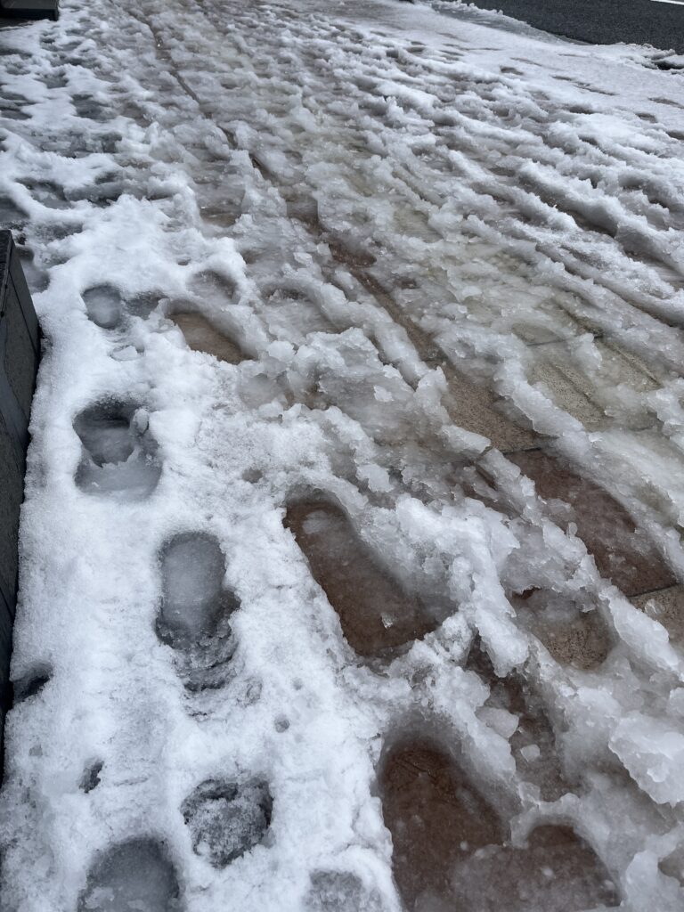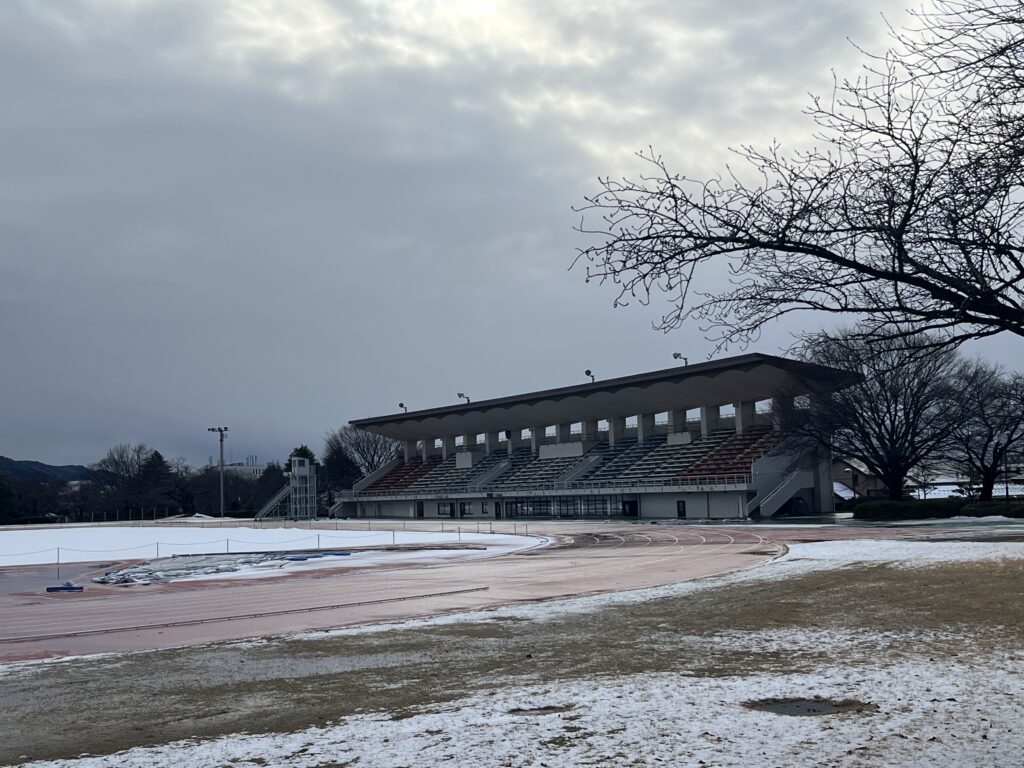 敷地外から覗いてみると、芝生には薄らと雪があるものの、トラックレーンは走れそうです。