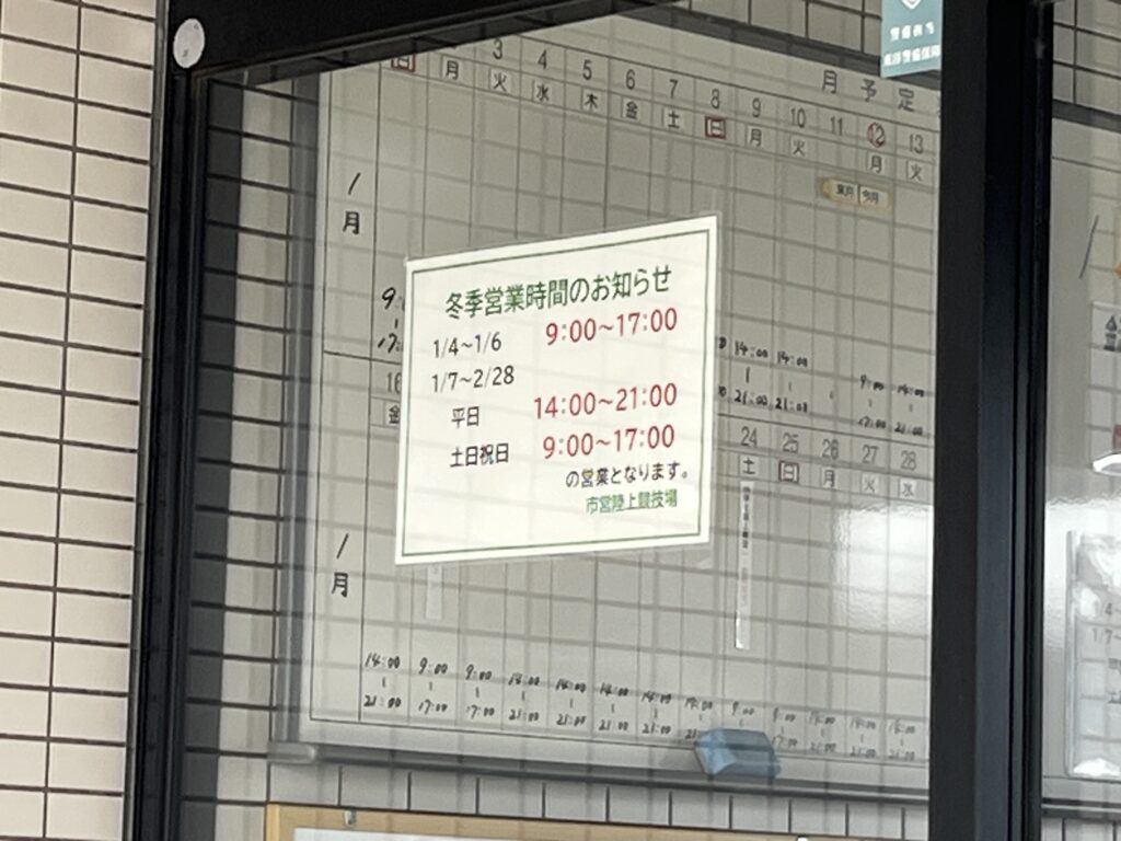 玄関口の方に営業時間のお知らせがあったので、写真を撮っていると、中から管理人さんが現れて、「今日、使えますよー」と、声をかけられました。