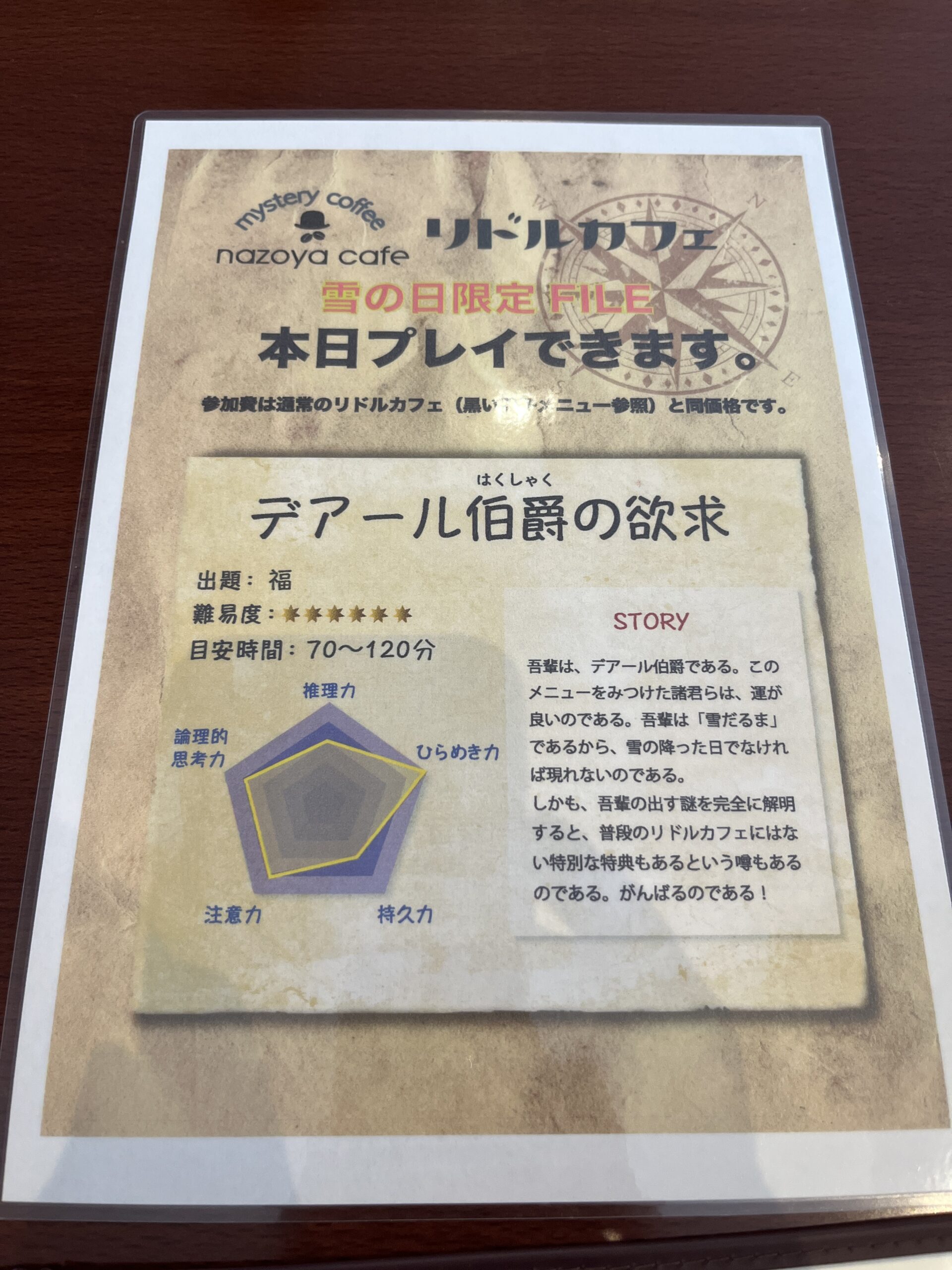 今回挑戦するのはリドルカフェですが、なんと雪の日限定だそうです。