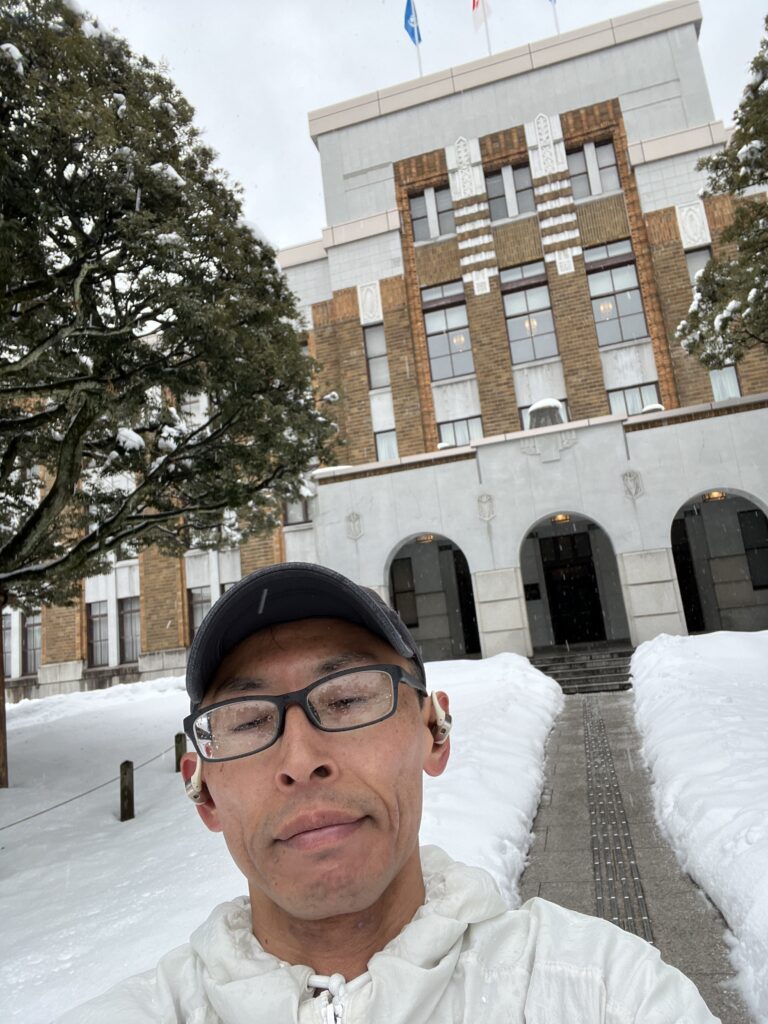 しいのき迎賓館の正面で自撮りしてみたら、自撮りしてるくせに目をつぶってましたw