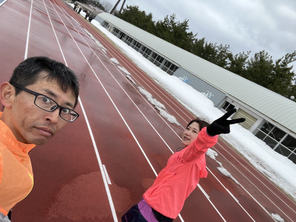 まだ、雪がそこそこ残ってますが、こちらのサブトラックで練習開始です。