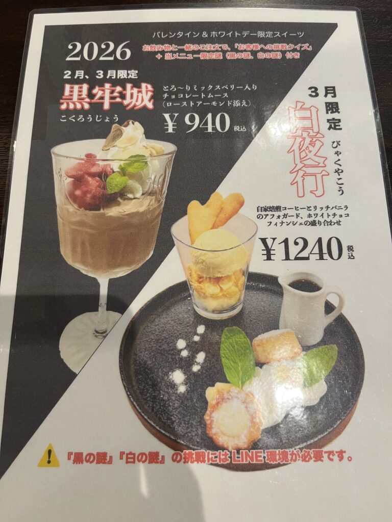 これらの限定スイーツを頼むと、それぞれ黒の謎・白の謎をもらえるのでお得です。