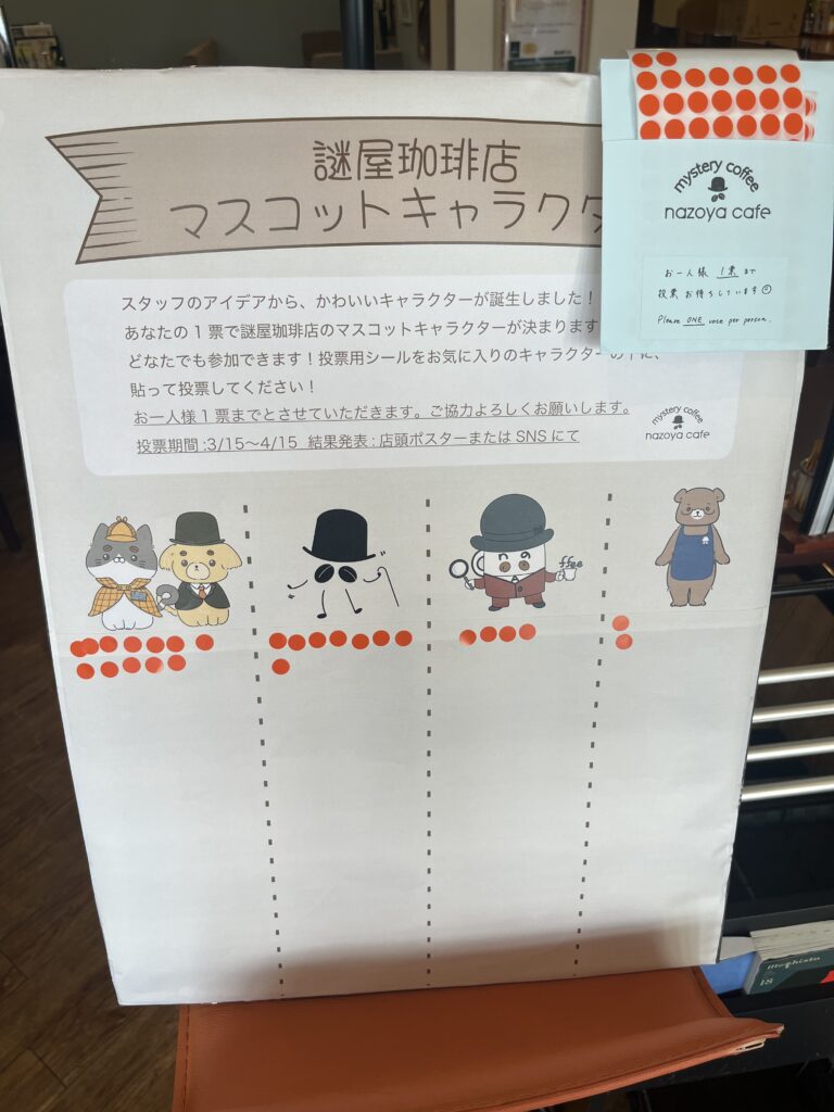 帰り際に、謎屋珈琲店のマスコットキャラを決める投票が実施されてたので、投票して来ました。