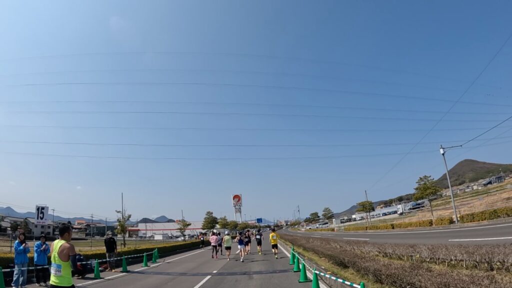 そして、15キロ地点は、59分06秒でした。(5キロラップ、19分41秒)