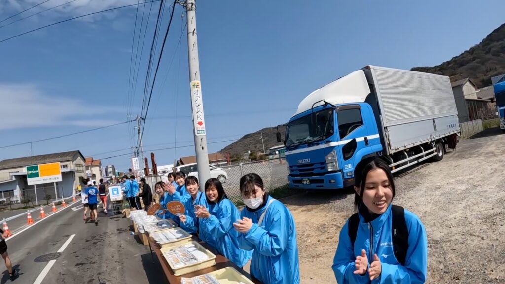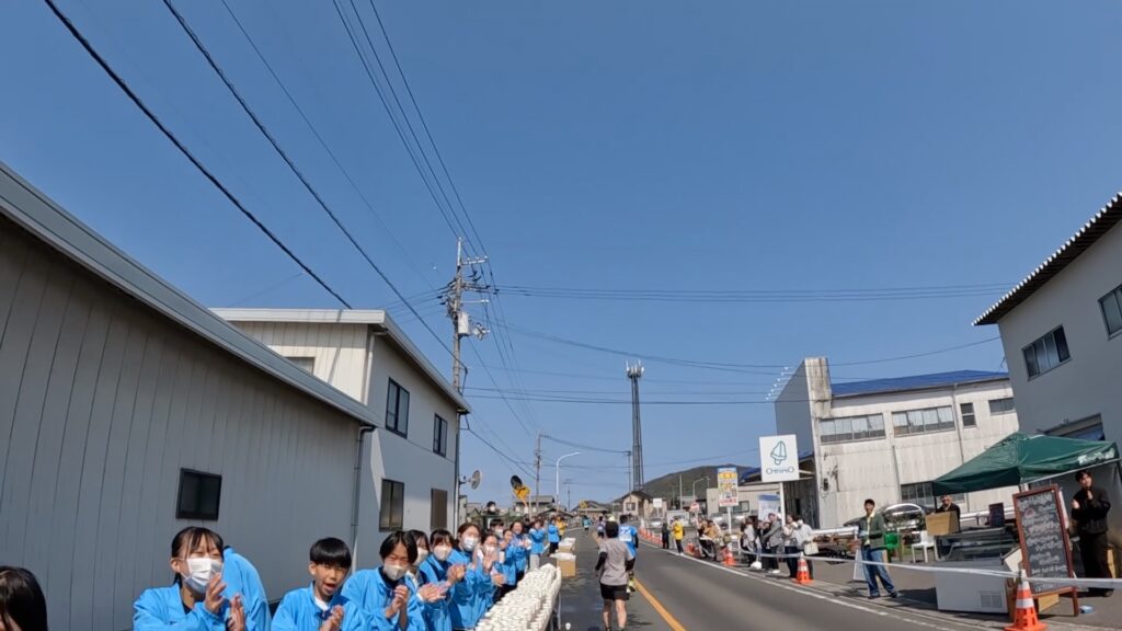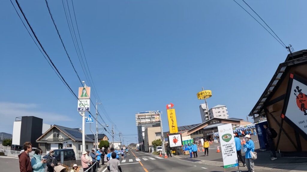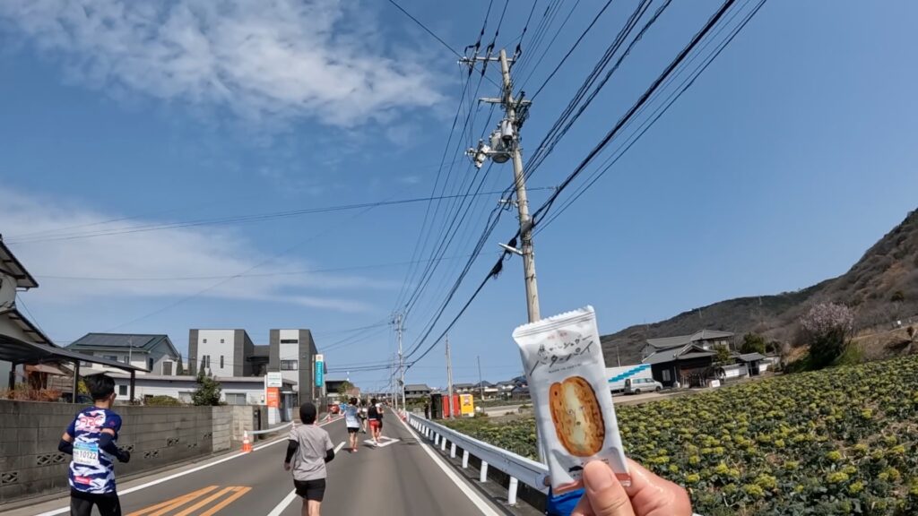 写真では分かりづらいかもしれませんが、左手に給水エイドが見えており、2RUNを口の中に入れつつ給水を取ることに集中したため、右手の看板に気づかなかったのだろうと思います。