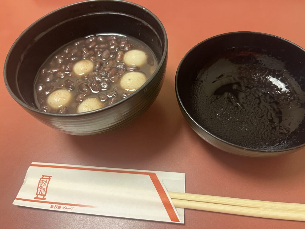 食後のデザートとして、ぜんざいもいただき、腹パン作戦を決行しました。