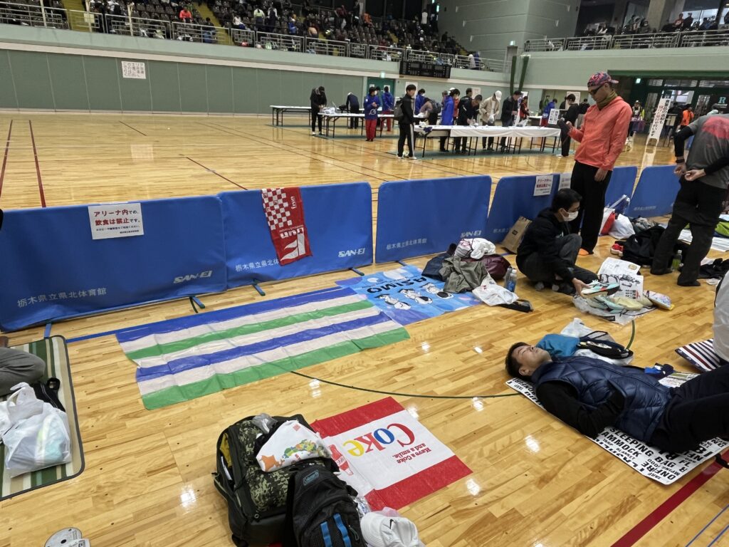更衣室兼貴重品預かり場所となる体育館では、チームメンバーが場所取りしてた所を使わせていただきました。