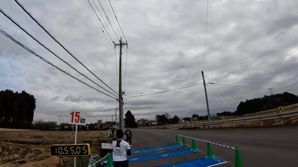 15キロ地点、55分07秒。(5キロラップ、18分15秒)