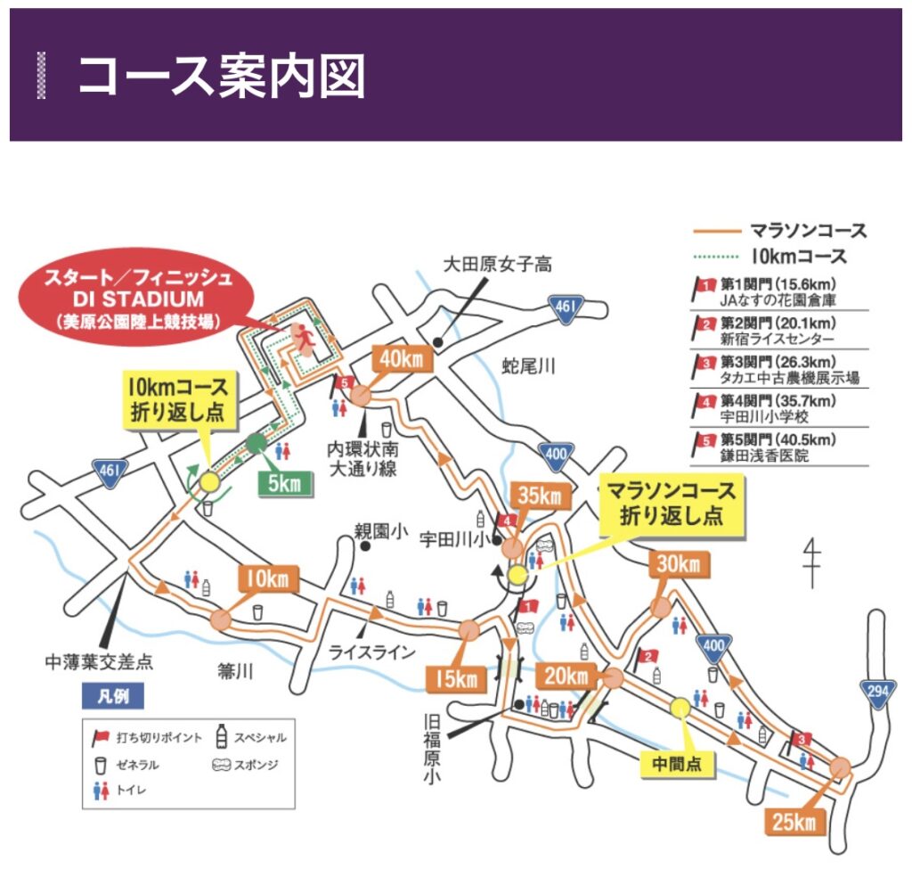 25キロ地点で進行方向を北西に変え、スタート地点の美原公園陸上競技場まで戻ってきたらゴールとなります。