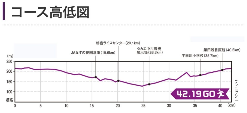 25キロ地点の前後で、コースの起伏が反対になる特徴的な高低図で、前半の下り基調のところで飛ばしすぎず、後半に足を残しておく事が大事だと思われます。