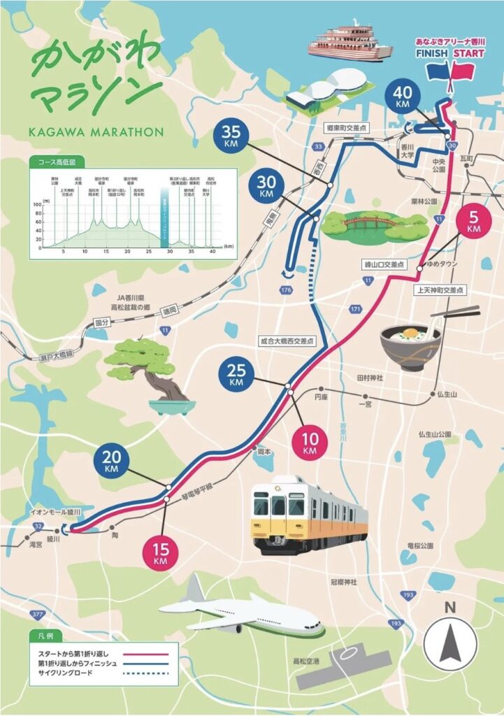 折り返した後は、26キロ付近まで同じ道を引き返し、香東川沿いに北上、最後はあなぶきアリーナ香川に戻ってゴールとなります。