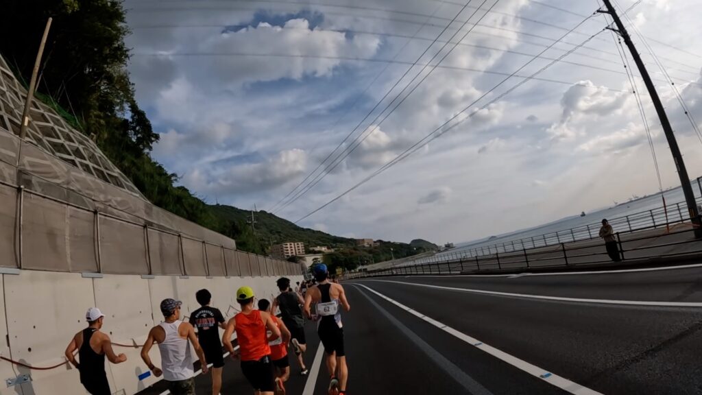 その関門橋をちょうど潜ろうとした時、目の前に、大会でよく見かける赤シャツのランナーを見つけました。