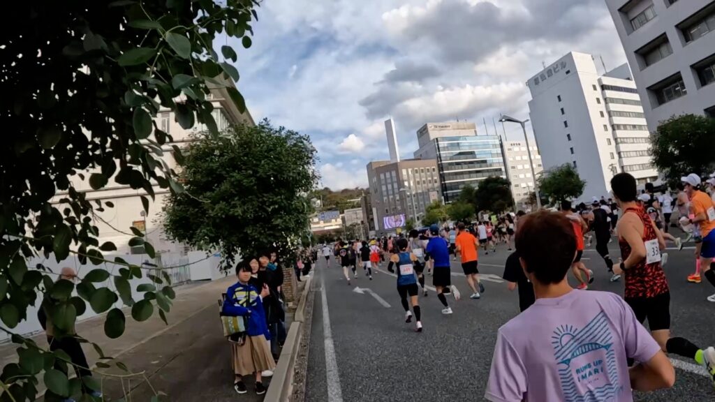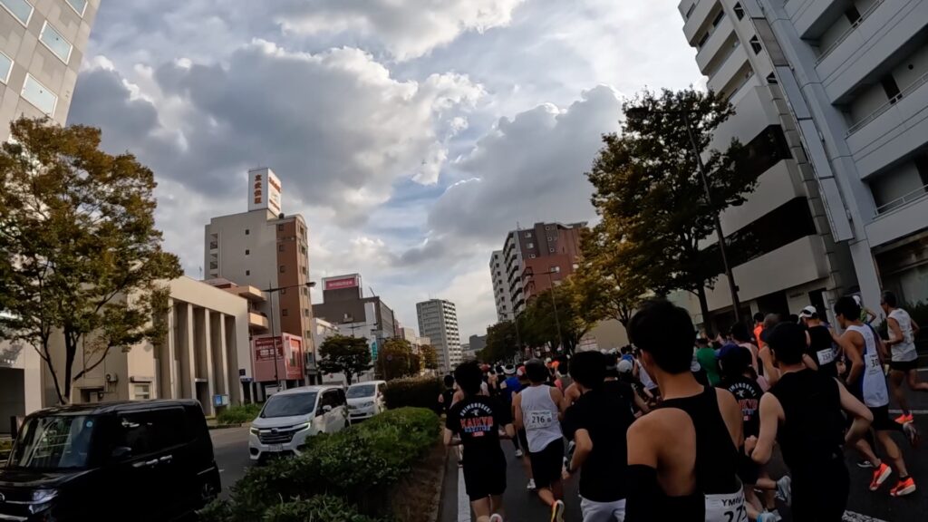 左折後、すぐ右折するコースのため、ランナーがみんな右寄りになって、目の前が開けたので、ここでペースアップします。