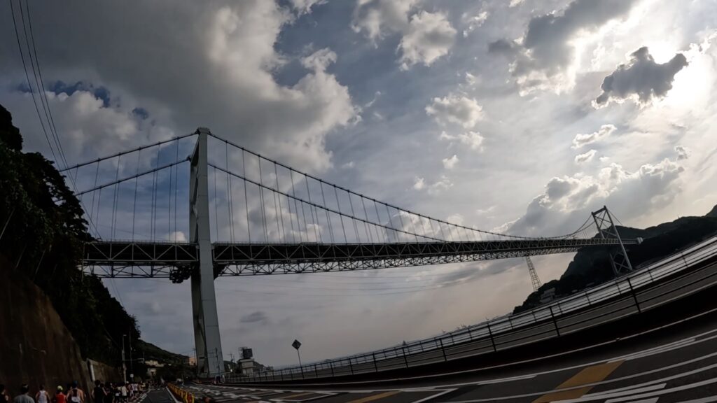 3キロくらいで、前日の散策ランでも見た、関門橋が見えてきました。
