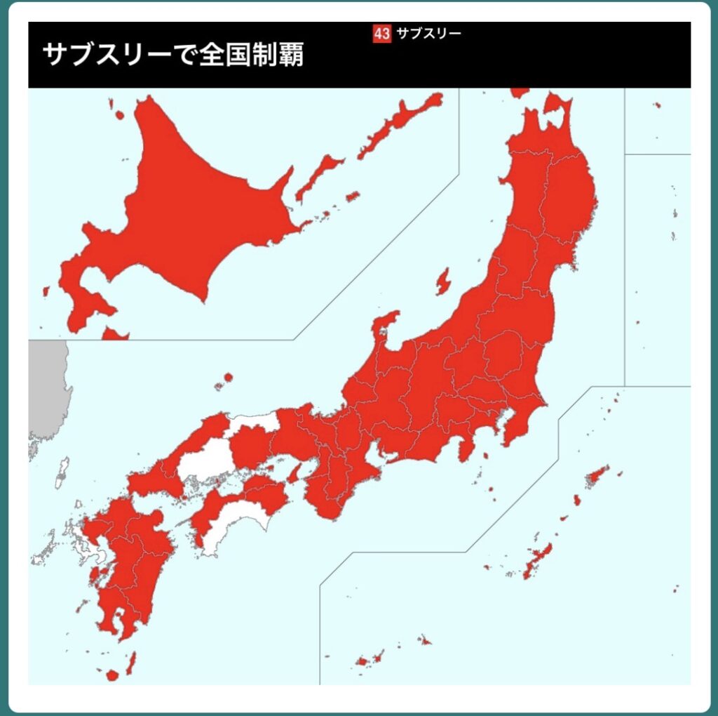 現時点で言うと、43都道府県の内、39都道府県がサブエガとなっています。(赤・オレンジ・黄色がサブエガ)
