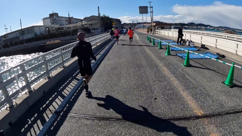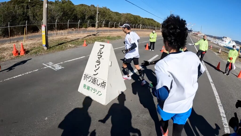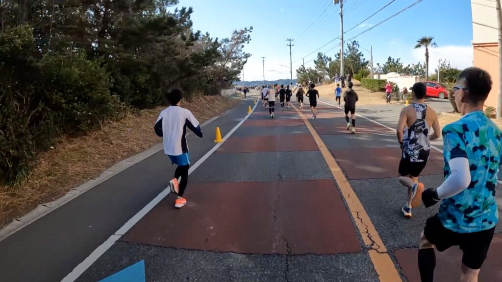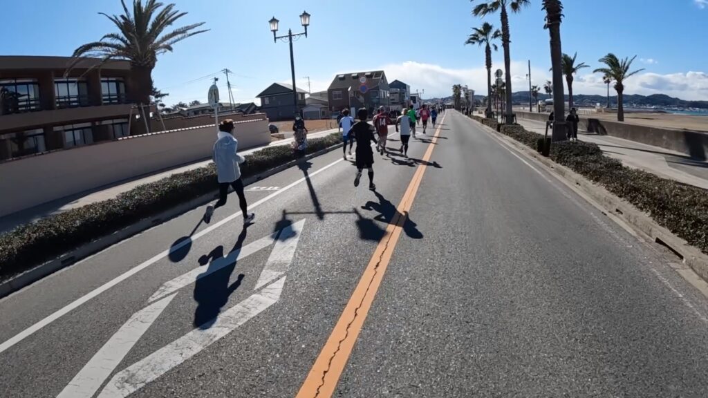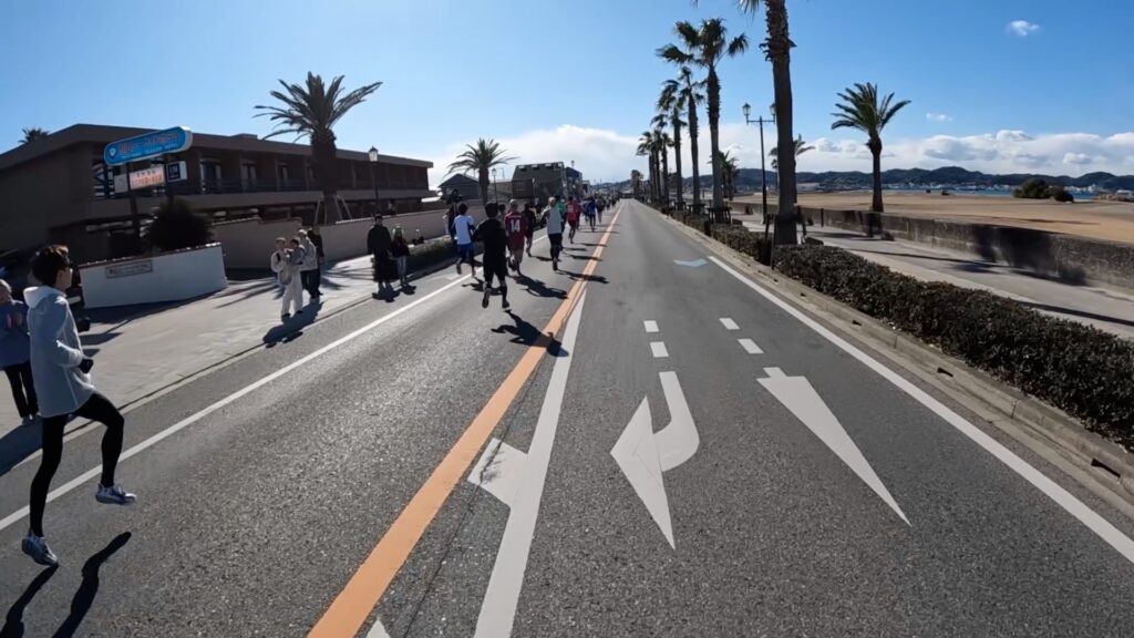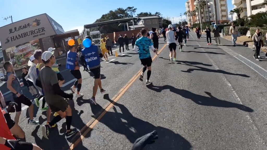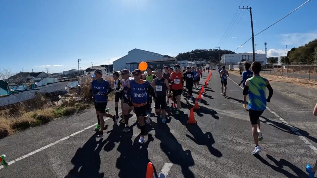 最近、東京マラソンの動画でサブスリー周辺を見ましたが、満員電車かと思うくらいギュウギュウだったので、このくらいまばらで走れる大会の方がいいですね。