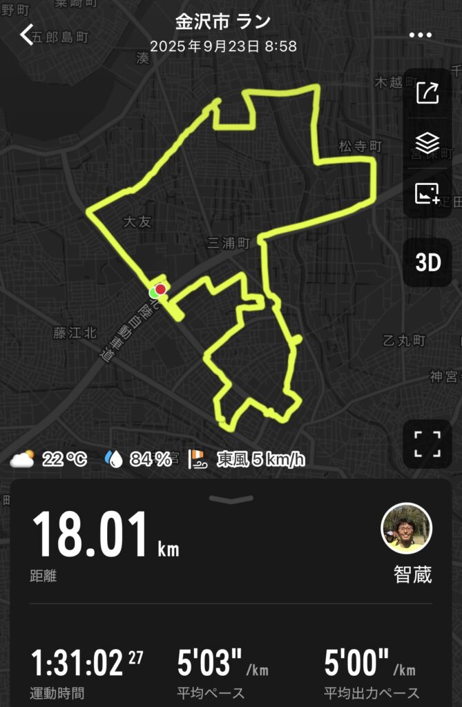この日、使える時間は、約100分なので、キロ5で走って20キロといったところです。
