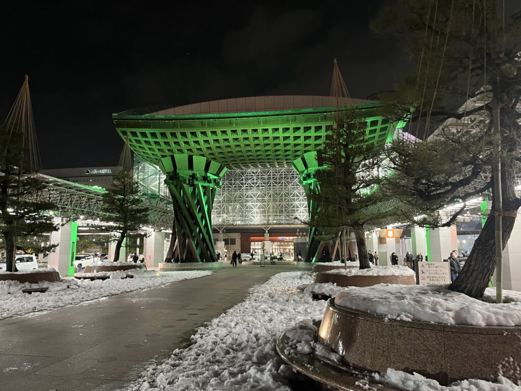 金沢駅の鼓門はちょうど色の変わるタイミングでのライトアップでした。